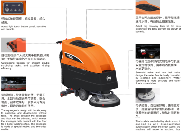 -刷盤(pán):電子控制,自動(dòng)裝卸刷,使用更方便;刷盤(pán)運轉時(shí)牽引機器移動(dòng),降低蓄電池能量損耗,續航時(shí)間更長(cháng)久。